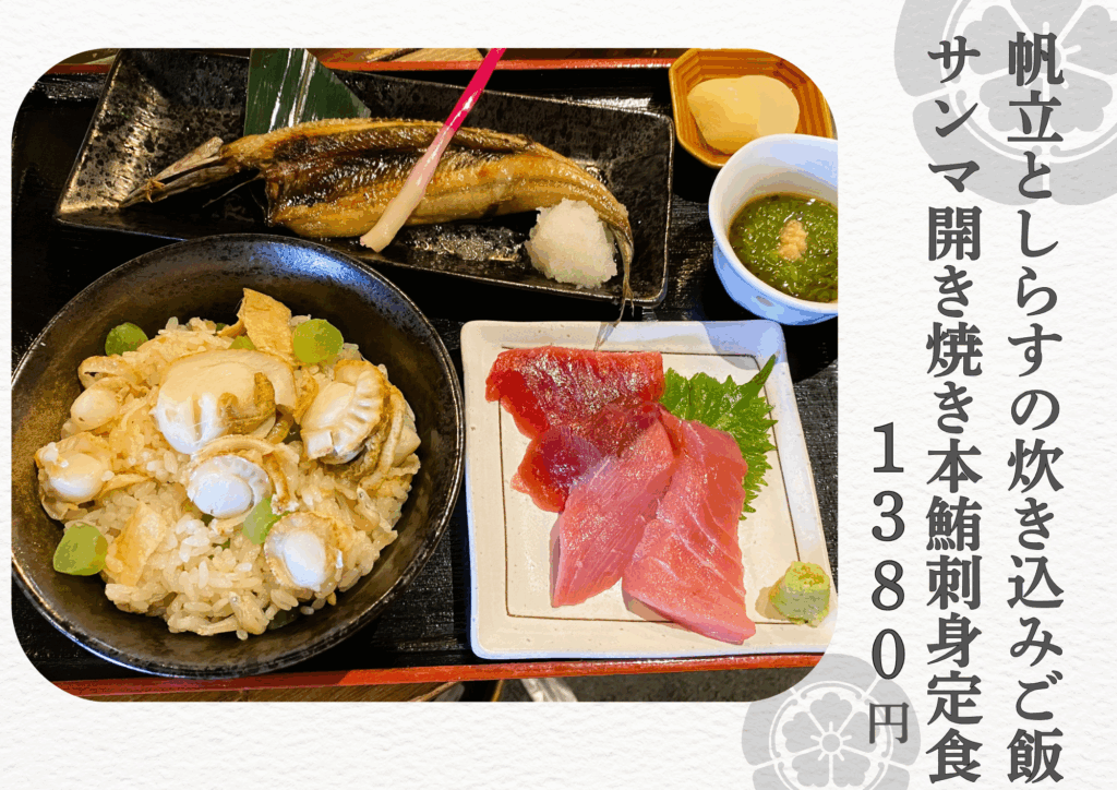 日替わりメニューに【ほたてとしらすの炊き込みご飯サンマ開き焼き本鮪刺身定食】
